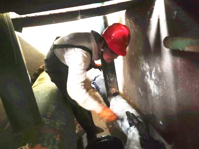原鹵管線是采鹵崗位重要的組成部分,是停車必檢項之一。但是檢修難度不小,一是過道空間狹小,光線昏暗,一次僅夠兩個人同時作業(yè);二是檢修原鹵管線時,必須“涉水”作業(yè)。檢修期間原鹵管線一閃一閃的焊光將周圍照亮,順著火花向里看去,只見有兩個人在狹小的空間綣著身子低頭忙活著,感覺身子都轉(zhuǎn)不開的樣子。他們像小貓似的蜷縮在兩邊,全身濕透,白色的工服也被銹漬染的亂起八糟,被油漬沁透成一坨一坨的,但他們堅定的眼神、專注的神情卻叫人佩服。我不禁問道:“這么窄的空間人咋進去。俊他們開玩笑的說:“用縮骨功!”
