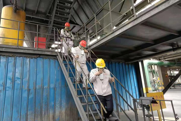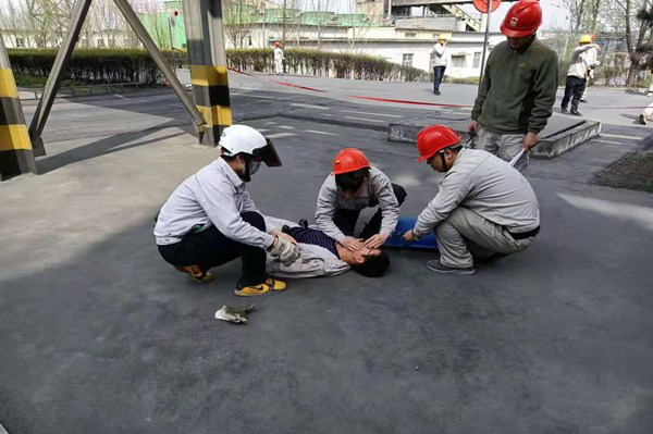 本次演練模擬以煤氣泄漏、人員中毒為方案開展的應(yīng)急救援演練,電石二裝置中控室操作人員發(fā)現(xiàn)3#凈化刮板機故障,通知兩名巡檢人員攜帶報警儀及防毒面具至現(xiàn)場檢查設(shè)備故障原因,前方行走人員至四層樓梯口處看見刮板機側(cè)板磨穿,刮板機卡住,由于未打開一氧化碳報警儀,未及時發(fā)現(xiàn)煤氣泄漏,上前查看時吸入煤氣中毒暈倒,后方協(xié)同巡檢人員發(fā)現(xiàn)后逐級進行匯報,公司迅速啟動了應(yīng)急預(yù)案,按照預(yù)案對事故現(xiàn)場進行了封鎖、檢查及搶修,在整個演練過程中,應(yīng)急救援的物資裝備及時到位,參加演練的各專業(yè)隊伍行動迅速,采取的救援行動基本恰當(dāng)。