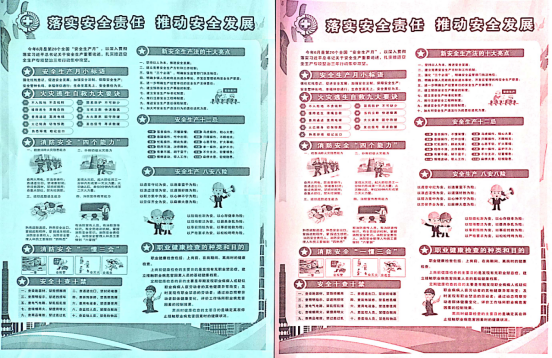 宣傳活動周。通過現場懸掛“安全生產月”相關內容的橫幅,張貼標語和宣傳畫,設置公共宣傳欄,組織員工觀看警示教育視頻,營造"安全生產月"活動氛圍。緊扣 “落實安全責任,推動安全發(fā)展”活動主題向大家發(fā)放了宣傳安全生產政策法規(guī)、防災減災宣傳單;現場講解安全科普常識、機械傷害知識及應急處置技巧,增強大家的安全生產意識,營造了濃烈的安全生產氛圍。此次安全生產月共計發(fā)放宣傳資料1100余份,懸掛宣傳橫幅2條,組織員工觀看警示教育視頻8場次,鼓勵員工參加漫畫制作、征文比賽等相關活動。通過此項活動,進一步強化廣大員工對“紅線意識”、“底線思維”、“安全發(fā)展理念”等安全生產重要論述的再學習和再領會。