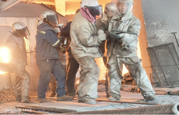 出爐工,是這里的主角。他們身著被汗水反復(fù)浸透又烤干、結(jié)出白色鹽漬的阻燃服,頭戴沉重的防護(hù)頭盔,像無(wú)畏的戰(zhàn)士,堅(jiān)守在陣地的最前沿。他們的工作,是時(shí)刻關(guān)注爐況,用長(zhǎng)長(zhǎng)的鋼釬疏通投料口,防止“棚料”。每一釬下去,都需要全身的力氣,與爐內(nèi)黏稠的料漿抗?fàn)。汗水從額頭滾落,迷住雙眼,卻來(lái)不及擦拭,因?yàn)闋t火不等人。