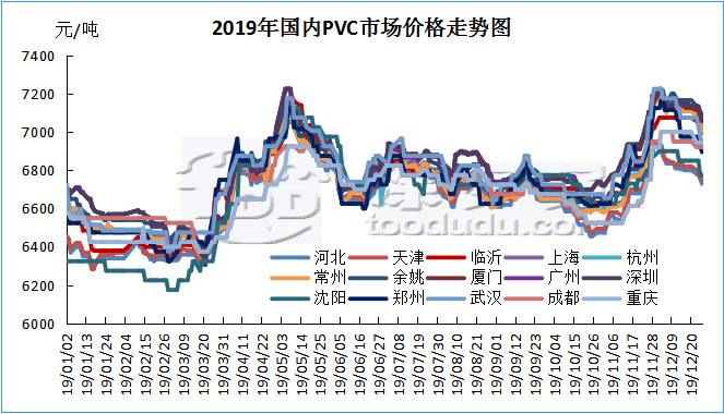 2019年中國(guó)國(guó)內(nèi)PVC市場(chǎng)仍舊是價(jià)格高位整理的一年,全年價(jià)格波動(dòng)區(qū)間以華東主流為例在6440-7225元/噸之間,高低價(jià)差785元,從走勢(shì)圖以及月均價(jià)走勢(shì)可以看出,2019全年經(jīng)歷兩撥較大幅度的推漲,其中第一季度1-3月份市場(chǎng)較為低迷,處于低谷整理期,4月份開始市場(chǎng)價(jià)格開始緩慢上漲,經(jīng)歷不斷的上漲價(jià)格在5月中旬開始達(dá)到年內(nèi)第一次高點(diǎn),價(jià)格達(dá)到高點(diǎn)后,需方承受能力有限,價(jià)格開始下行,下行至6月中下旬后,市場(chǎng)開始進(jìn)入緩慢的整理期,長(zhǎng)達(dá)4個(gè)月,6月中下旬-10月中旬,價(jià)格一直處于小幅震蕩整理中,供需雙方的博弈一度令PVC整體產(chǎn)業(yè)鏈進(jìn)入迷茫期,多數(shù)行業(yè)內(nèi)人士甚至認(rèn)為PVC產(chǎn)品的下跌大周期開始來(lái)臨,我們回顧下往年的PVC行情,其價(jià)格在15年5月初達(dá)到最低點(diǎn)后內(nèi)蒙出廠4350元/噸含稅,價(jià)格在歷史低點(diǎn)后開始不斷反彈,在經(jīng)歷了16-18年的整理后,在19年中國(guó)國(guó)內(nèi)PVC市場(chǎng)仍占據(jù)高點(diǎn),四年間PVC生產(chǎn)企業(yè)賺的盆滿缽滿。但下游制品企業(yè)卻苦不堪言,并且自18年國(guó)家稅控改革以來(lái),次終端貿(mào)易商對(duì)稅票逐漸失去控制,導(dǎo)致次終端利潤(rùn)不斷下滑,規(guī)范的市場(chǎng)導(dǎo)致票貨分離減少。而在整個(gè)PVC產(chǎn)業(yè)鏈中,生產(chǎn)企業(yè)占據(jù)越來(lái)越多的話語(yǔ)權(quán),從而導(dǎo)致了雖然我們看到在迷茫期過(guò)后,第四季度國(guó)內(nèi)PVC市場(chǎng)仍舊迎來(lái)年底第二次大漲,此次上漲把PVC價(jià)格推上了真正的年底高點(diǎn)。第四季度的上漲導(dǎo)火線為內(nèi)蒙企業(yè)裝置出現(xiàn)意外事件停產(chǎn),市場(chǎng)炒作聲漸起,價(jià)格開始上漲,而隨后的11-12月份,在期貨的帶動(dòng)下,價(jià)格不斷被推上新高。12月中旬需方面對(duì)如此高的價(jià)格開始產(chǎn)生抵觸心理。而此時(shí)的年度備貨來(lái)臨,市場(chǎng)不但沒(méi)有復(fù)漲反而開始進(jìn)入蕭條期,價(jià)格開始下滑。