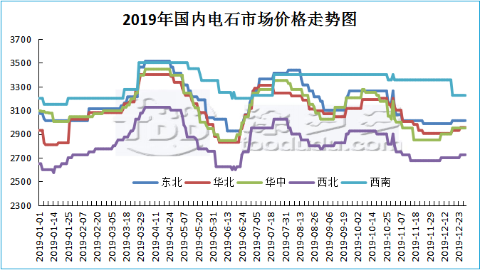 2019年中國(guó)國(guó)內(nèi)電石走勢(shì)上半年跟隨PVC走勢(shì)類似,第一季度震蕩上行整理,4月份到達(dá)年度高點(diǎn),但隨后價(jià)格開始下行,下行至6月中旬又開始震蕩上漲,隨后的三四季度震蕩走低中。整體來(lái)看作為PVC上游原料,電石的走勢(shì)類似于PVC走勢(shì),但并不完全相同,尤其下半年,我們可以推測(cè),下面的PVC收到資金以及市場(chǎng)炒作以及期貨方面的影響較大,并不是從供需、原料方面受到影響。