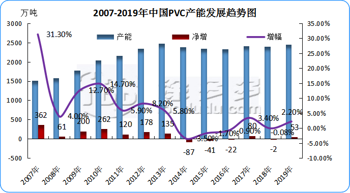 2.1 2007年-2019年中國(guó)聚氯乙烯產(chǎn)能走勢(shì)圖