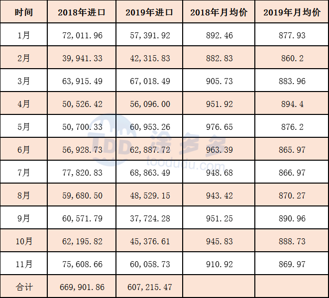2019年1-11月累計(jì)進(jìn)口數(shù)量為607215.47噸,同比去年減少62686.39噸。跌幅9.36%,國(guó)內(nèi)產(chǎn)能供給充裕,進(jìn)口量大幅下跌。