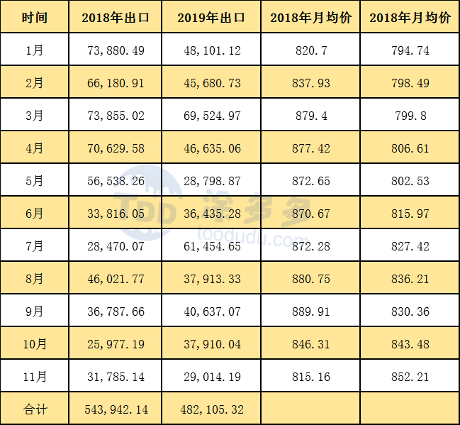 2019年1-11月累計(jì)出口數(shù)量為482105.32噸,同比去年減少61836.82噸。跌幅11.37%,進(jìn)出口抵消來(lái)看,國(guó)內(nèi)市場(chǎng)供需變化不大。出口數(shù)量的減少?gòu)浹a(bǔ)了進(jìn)口的減少。