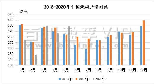 根據(jù)百川統(tǒng)計數(shù)據(jù),2020年1-6月燒堿折百產(chǎn)量約1685.7萬噸,同比下滑2.9%。