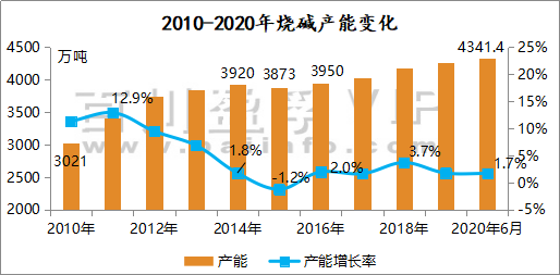 由此可見,2020年全國總產(chǎn)能實現(xiàn)穩(wěn)步增長,但整體增速相比同期有所下降,受全球公共衛(wèi)生事件沖擊,燒堿下游需求表現(xiàn)不佳,整體行情不甚樂觀。出于整體需求和供需平衡考量,預(yù)計未來產(chǎn)能增速將有放緩表現(xiàn),具體發(fā)展變化還需關(guān)注后續(xù)全球公共衛(wèi)生事件處置情況及市場行情實時變化。