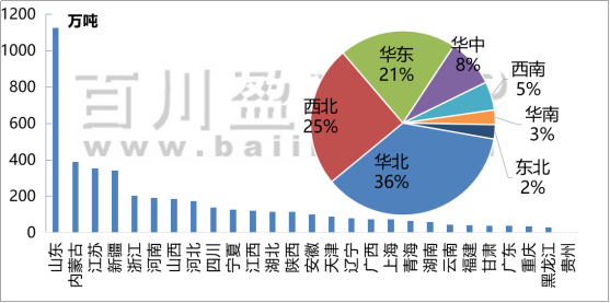 產(chǎn)能:增產(chǎn)集中地為江蘇、內(nèi)蒙古、山東、河北、新疆地區(qū),預(yù)計到2023年,中國燒堿產(chǎn)能約4600-4700萬噸,山東省燒堿產(chǎn)能將逼近1300萬噸,新疆維吾爾自治區(qū)燒堿產(chǎn)能有望突破400萬噸,江蘇、內(nèi)蒙古及新疆三地?zé)龎A生產(chǎn)能力旗鼓相當。