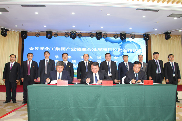 4月26日,寧夏金昱元化工集團(tuán)股份有限公司和吳忠市、青銅峽市政府在吳忠市舉行金昱元化工集團(tuán)產(chǎn)業(yè)鏈融合發(fā)展項(xiàng)目簽約儀式。吳忠市市委書記徐耀、市長王學(xué)軍,青銅峽市市委書記文學(xué)智、市長趙彥林等領(lǐng)導(dǎo)出席簽約儀式,金昱元化工集團(tuán)董事長代良云、總裁陳文泓等領(lǐng)導(dǎo)參加簽約儀式,簽約儀式由吳忠市市長王學(xué)軍主持。